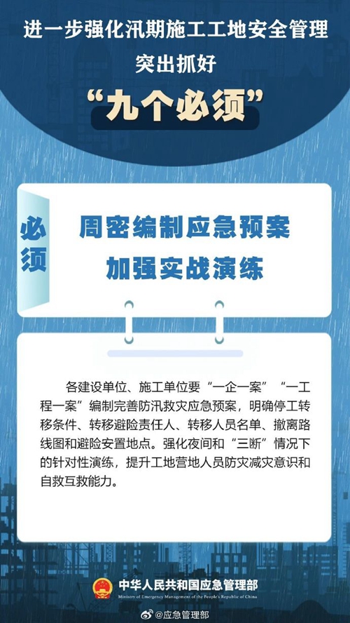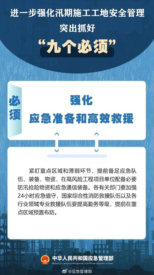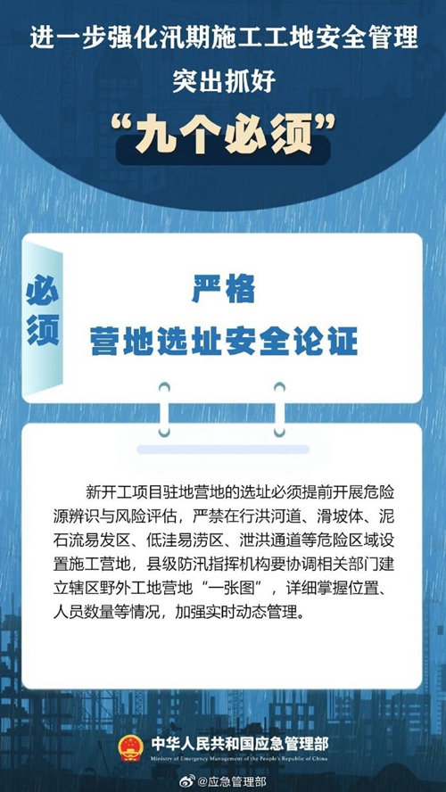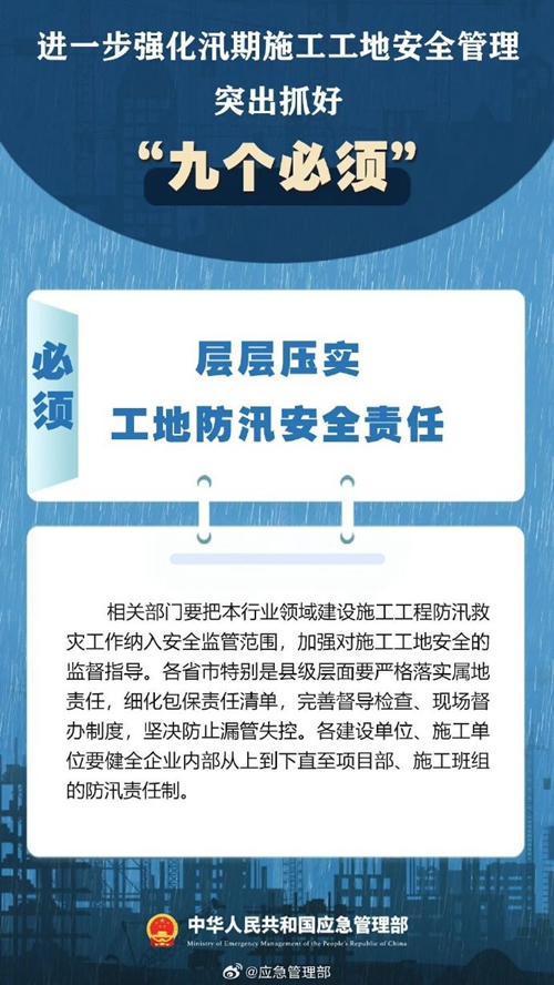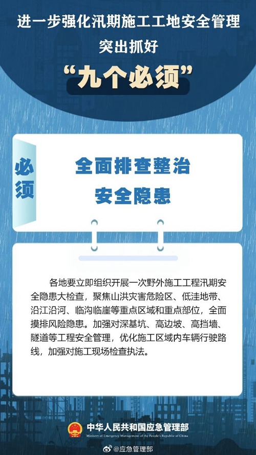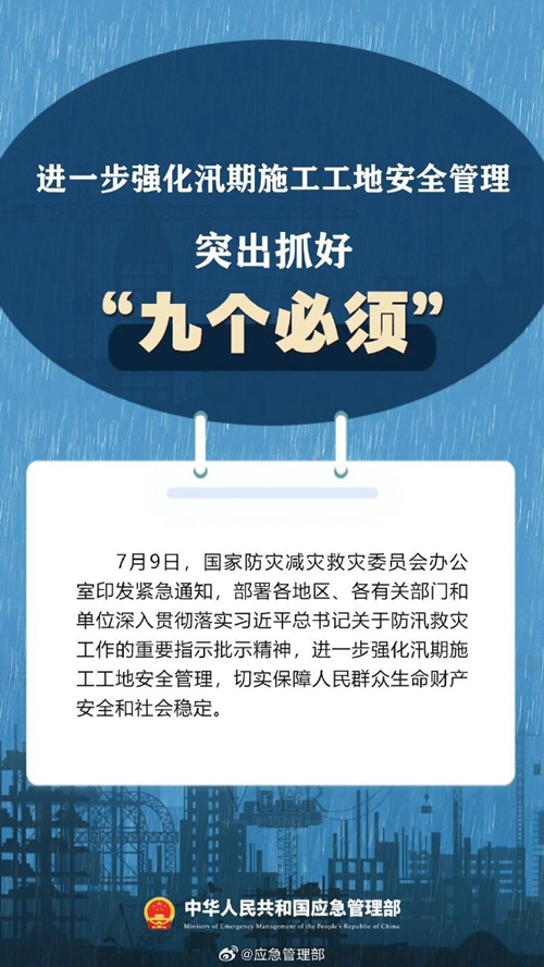 7月9日,國家防災減災救災委員會辦公室印發緊急通知,進一步強化汛期施工工地安全管理,要突出抓好“九個必須”↓↓ ???